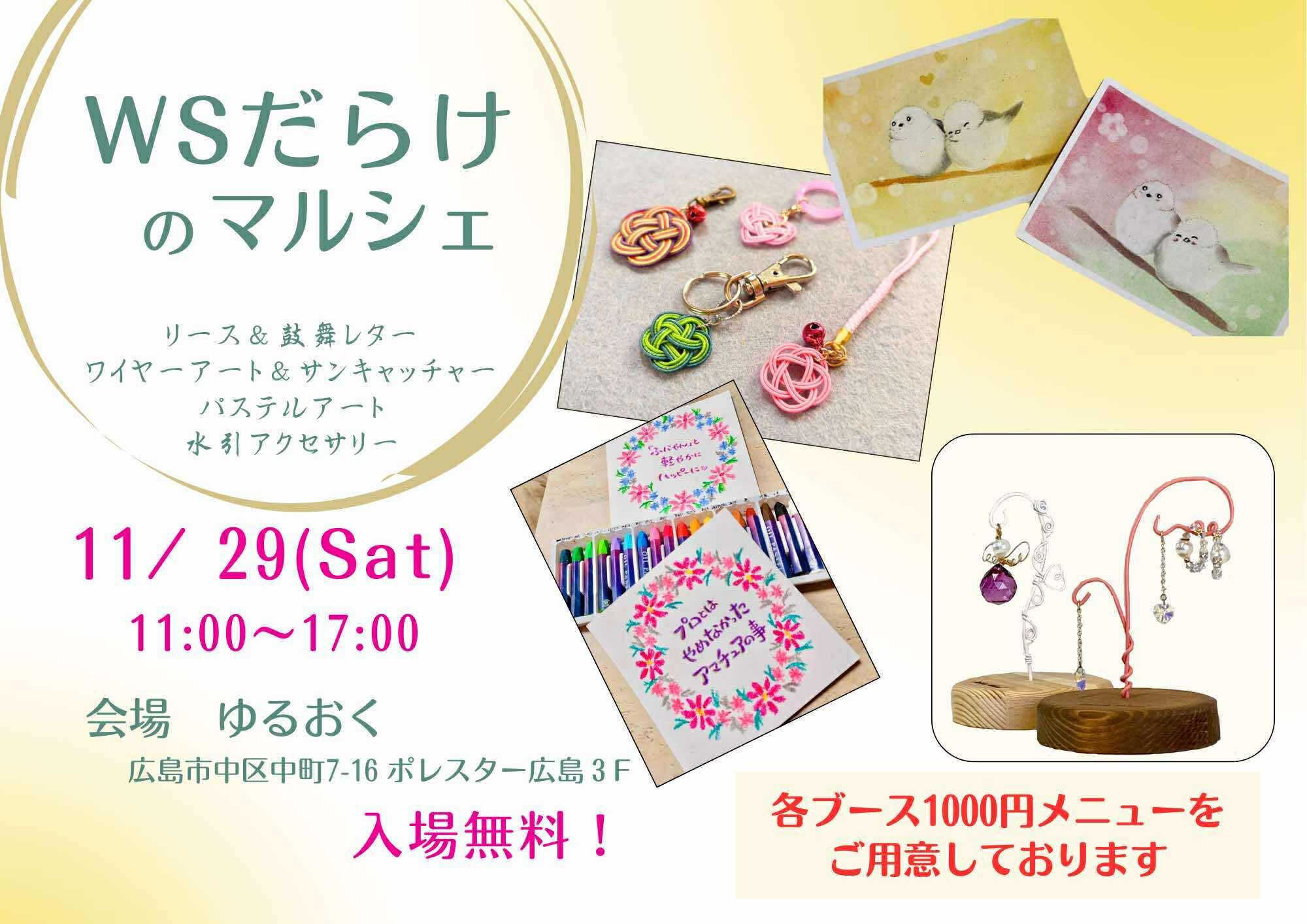 11月292025 11/29 “好き”を形に【WSだらけのマルシェ】 手作りするの大好きさん集まれ〜✨ ☆ワークショップだけを集めたマルシェ☆ 10:30〜17:00 〜自分の「好き」を形に〜 キラキラ・わくわく・うっとり・ハッピー WSの醍醐味は、なんと言っても 自分だけのオリジナル作品を作れること✨ 好きな色、好きなデザイン、好きを詰め込む 夢中になれる楽しい時間 初めての挑戦は興味津々 ワクワク、ドキドキ、出来上がりが楽しみ♪ 2度目、3度目の制作も楽しい〜〜 また違ったデザインで作ったり ちょっとハードルを上げて難易度の高い作品にトライしてみたり 想像が膨らむぅ マルシェの時間内なら、いくつのWSを巡ってもOK 時間を区切らず個別対応で講師がレクチャーしてくれます🌿 どんどん自分作品を増やしてみて😘 〜WSのご案内〜 ●ワイヤーアート&サンキャッチャー 講師:ホッと空間えん樹 大嵜早苗 幸せのサンキャッチャー✨ 世界にひとつ、私だけの光をつくって 心もお部屋もキラキラに! ① サンキャッチャー粒10個付1000円 ② ①+ワイヤーアート・・・ 1500円 ③ 2連サンキャッチャー・・ 2000円 ● オイルパステルで描く 『リース&鼓舞(こぶ)レター』 講師:おててや☆Rie 「私へ」のメッセージを込めて。 彩りのリースで心をリフレッシュ(ˊᵕˋ)ノ 簡単な技法を使ってオイルパステルでリースを描き、 見て気づきを得られ元気になれる 鼓舞レターでエネルギーチャージしてみませんか。 ○15cm角✕2枚··· ¥1000 ●型紙を使って描くパステルアート 『ほっこりシマエナガ』を描こう 講師:よしこ姉 初心者さん🔰でも、 型紙を使って書くので失敗知らず❣️ 今日の気分で選んだ🩵🩷色のパステルを 削って指でクルクル塗って、 型紙を使って塗ったり消したり、 集中するその時間が好き❤️ ハガキに描くので 飾っても良し、送って良しですよぉ〜 ○1回 1000円(30分〜1時間) ● 水引キーホルダー🌟 講師:にのん ご縁を繋ぐ・魔除けの意味を持つ水引 お好きな色を組み合わせて 可愛いストラップやキーホルダー 箸置きや箸袋などお正月小物を 作りませんか ①ストラップ 1個 1,000円 ②キーホルダー1個 1,500円 ③箸置き 2個 800円 ㅤㅤㅤㅤㅤㅤㅤㅤ4個 1,500円 講師プロフィール おててや☆Rie 日常に、彩りと癒しのひとときを🌿 手から生まれるアートとケアで、心と体をふにゃんと軽やかに。 パステルマンダラアート、オイルパステル、バッキーボール ハンド&ヘッドマッサージ etc. にのん さとう式リンパケアの理論から生まれた イヤーアクセサリーのチャームを 水引を含む色々なパーツで作っています ホッと空間えん樹 大嵜早苗 サンキャッチャーws さとう式リンパケア+Zero-g touchを使った 痛くないゆるふわBoby care 黄土漢方よもぎ蒸し 腸楽セラピー®︎ 等をしています よしこ姉 切り絵、ポーセルアート、ガラス絵の具、ワイヤーアート 箸置き、楊枝ケースなどなど 色々なハンドメイドを幅広く手掛けています。 開催日・参加費2025年11月29日(土) 10:30~17:00 ・入場無料 ・ドリンクコーナー無料 ・WSの参加費は各ブースによって異なります 会場ゆるおく (広島市中区中町7-16 ポレスター広島3F) アクセス:https://yuruoku.com/access/ 対象どなたでもご参加いただけます。 お子様連れもOKです。 お問合せcontact